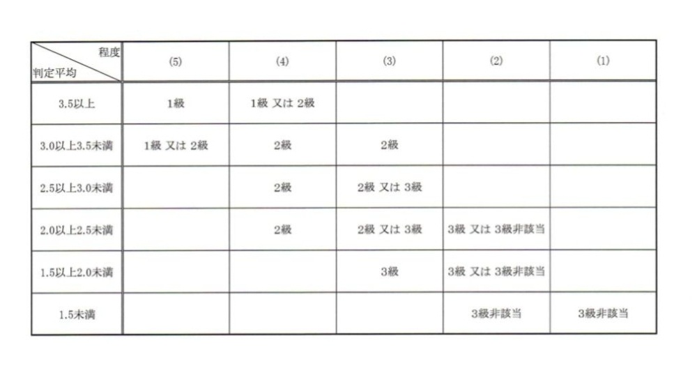 これら7項目について評価をして点数をつけ、合計点を7で割って出した平均点と、さきほどの5段階ございました「日常生活能力の程度」を下のマトリックスに当てはめ、交わるところが等級の目安となります。
